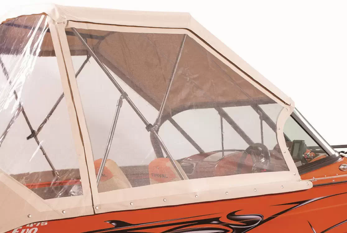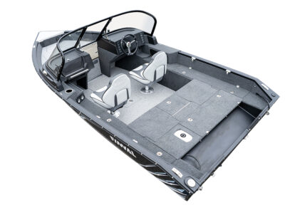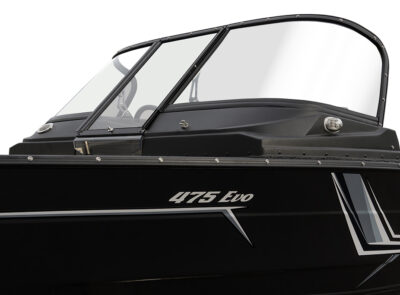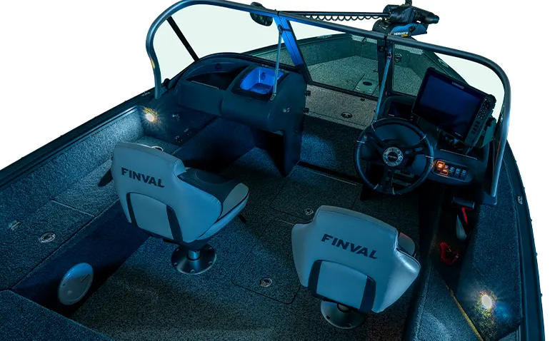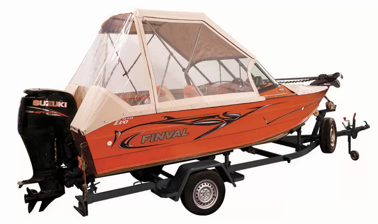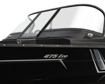 Finval 475 Evo DC is the widest among boats up to 5 meters long, with an aft deck 192 cm wide. This is enough for two people to comfortably fish together or relax lying on it. The boat is also convenient for travel. A Taylor Made® glass windshield protects both front and rear passengers from the wind. Numerous lockers and shelves allow organizing the interior space to keep things out of the cockpit. A High Top canvas enclosure helps shield from the sun in summer, and with side and back curtains attached, offers reliable protection from rain and cold wind. The layout of the bow and stern decks is customizable. All these features make Finval 475 Evo DC one of the most popular boats in Europe.
