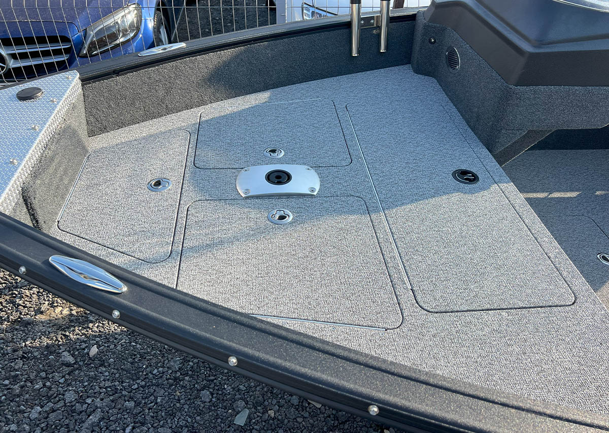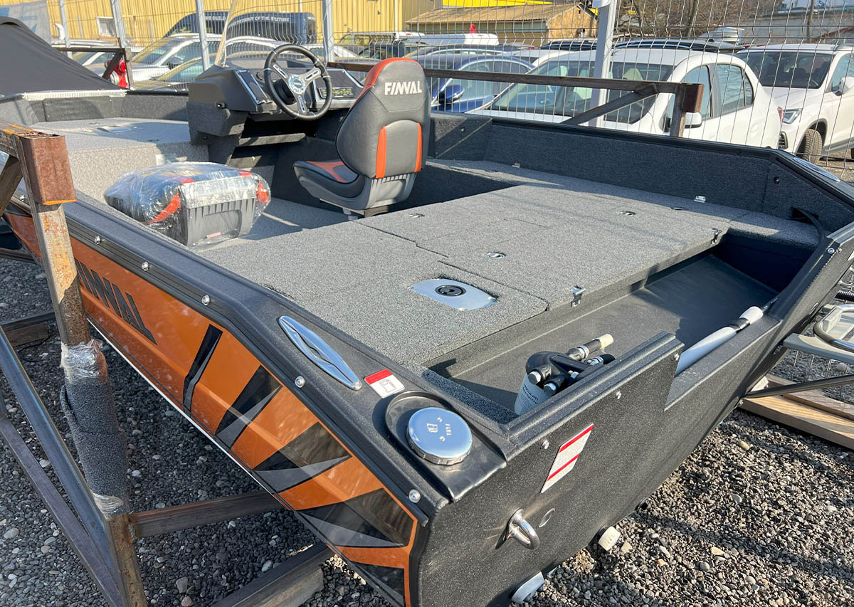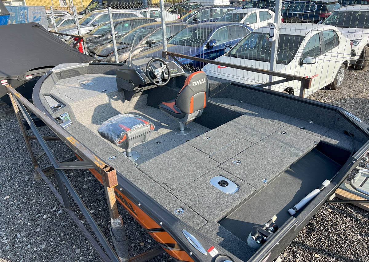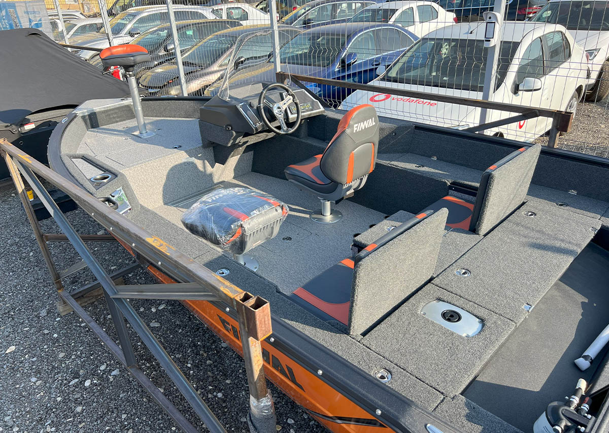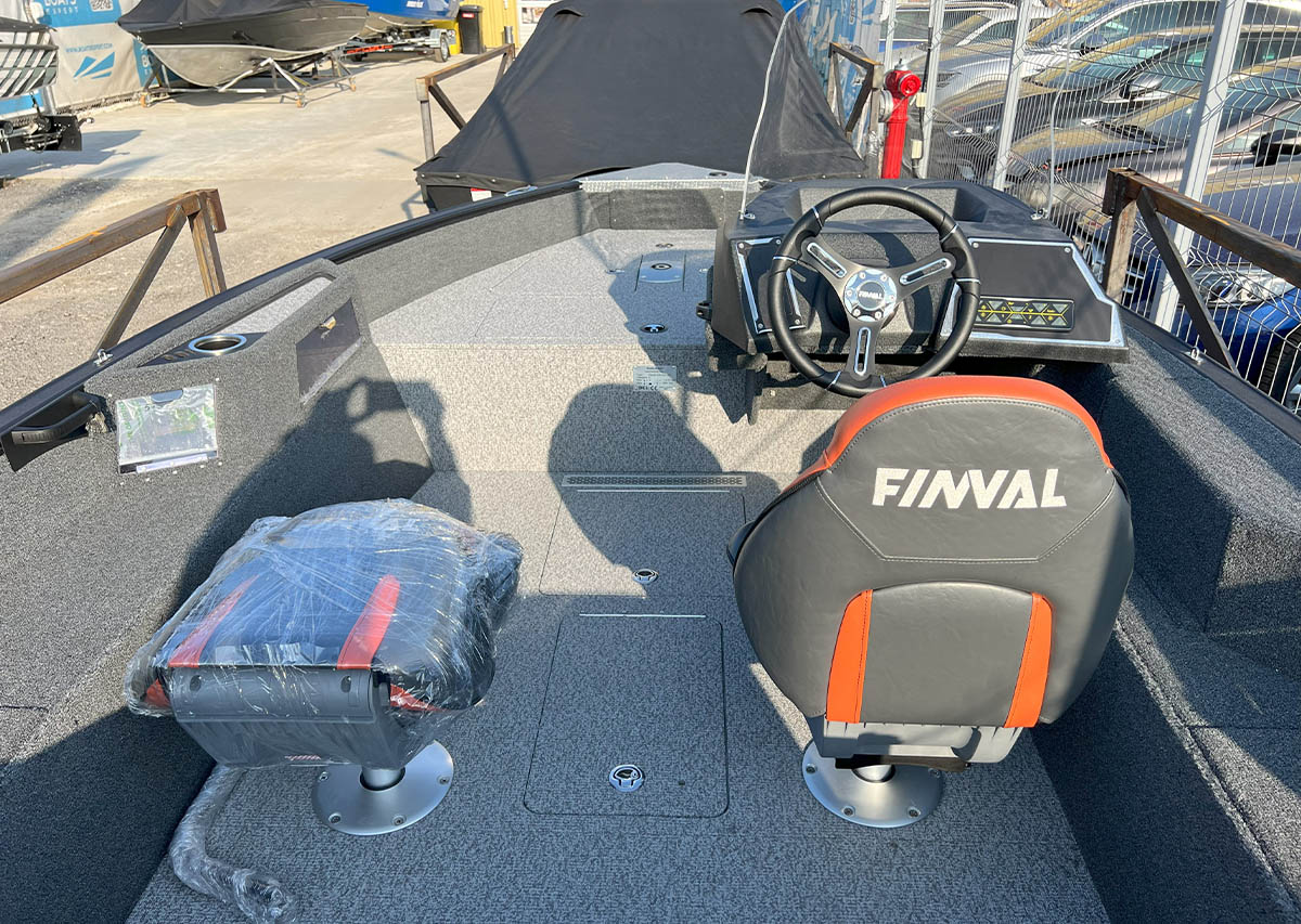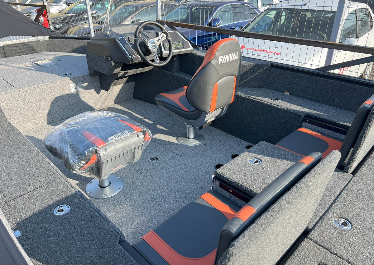 The Finval 475 Evo SC is a popular fishing boat with a spacious cockpit and wide aft deck. It features a functional driver’s console with anodized aluminum pads and the option to install two 12’’ echo sounders. A convenient glove box with a USB socket for charging phones is located next to the passenger seat. Suitable for both beginners and experienced anglers.