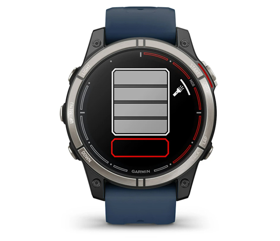 An internal, rechargeable lithium battery provides up to 16 days of battery life in smartwatch mode, up to 42 hours in GPS mode and up to 60 hours in UltraTrac™ battery saver mode.