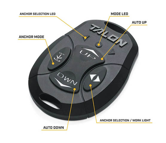 Talon Remote: Lets you control stow, deploy, anchoring modes, multiple Talon selection and work light; comes standard with one wireless remote