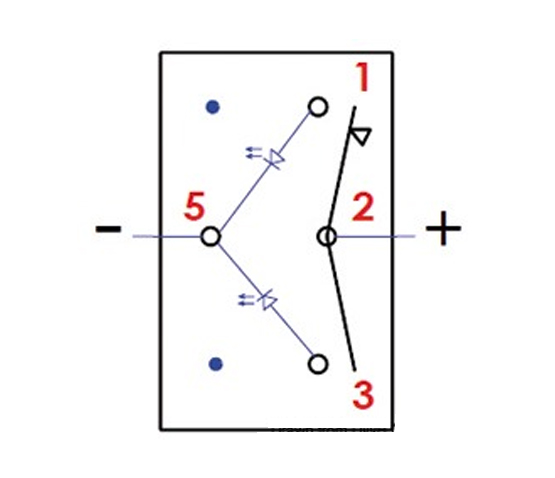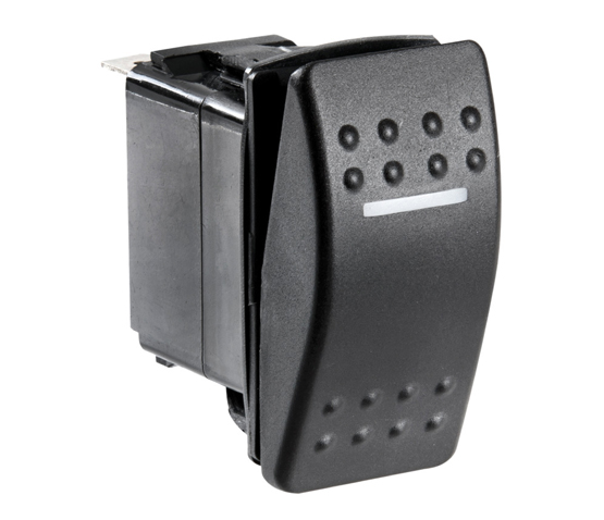 Installation requires a 21.5×36.8-mm rectangular bore. 20 A / 12 V max power. Rigid toggle and LED warning light that lights up the toggle to activate the contact.
