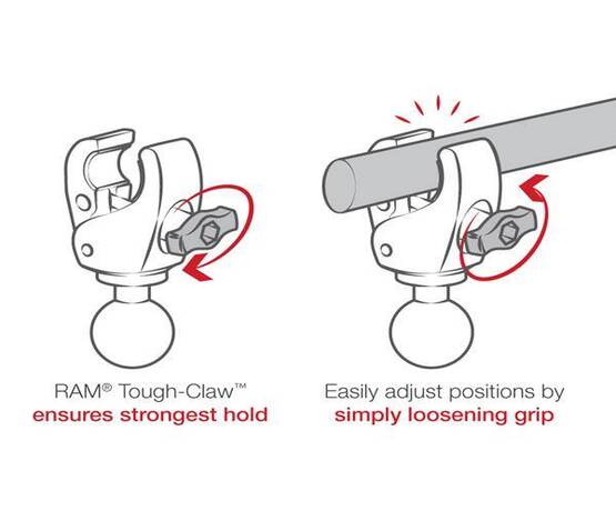 - Versiunea mică a bazei RAM® Tough-Claw™ este proiectată pentru a se fixa rapid pe șine și bare rotunde, pătrate și cu forme neobișnuite cu un diametru exterior cuprins între 0,625″ și 1,5″; pad-urile de cauciuc asigură prindere stabilă și protecție a suprafeței de montare.